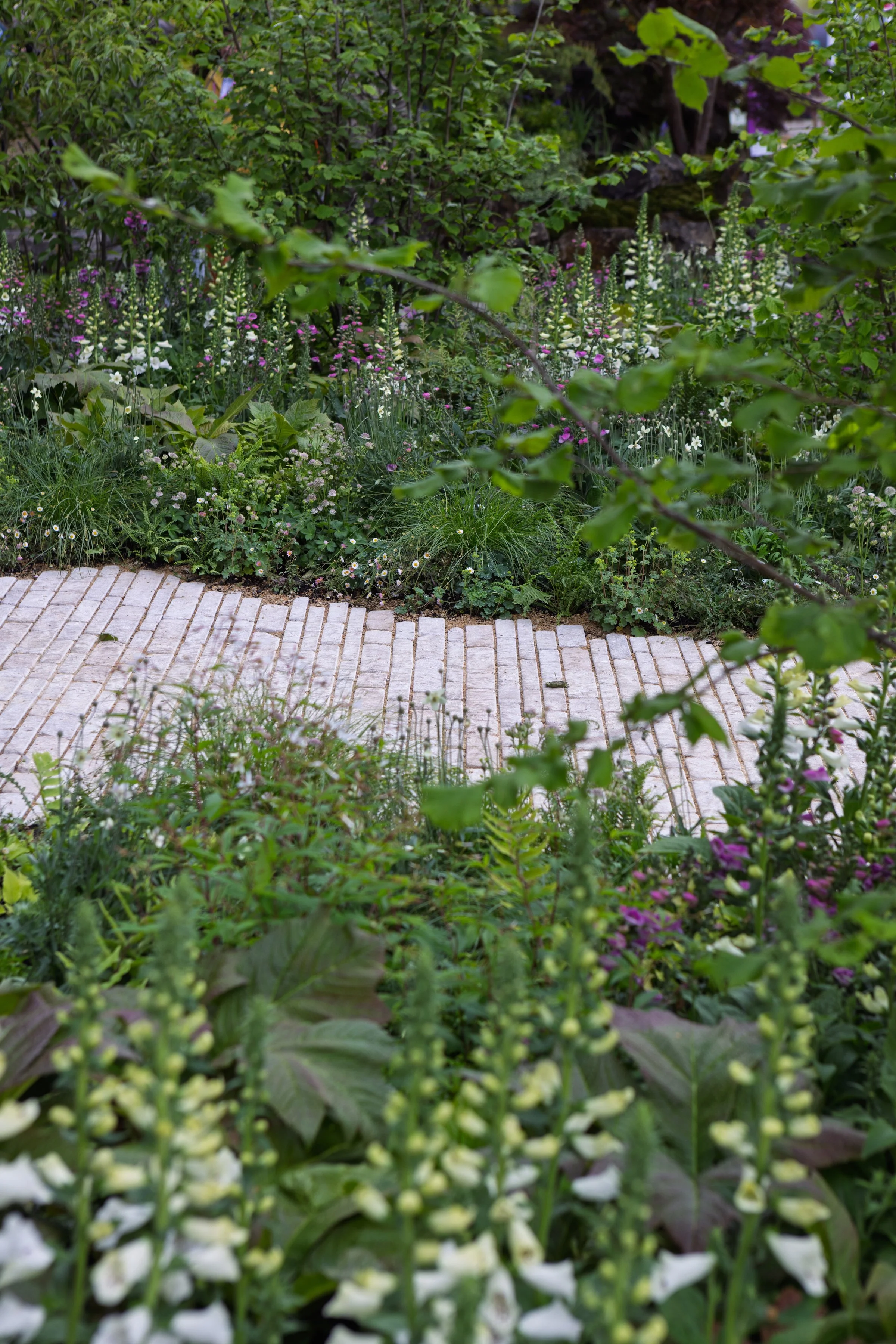 Running through the middle of the garden was a generous path leading to the RHS hub building. The path featured a staggered edge, with planting pockets that left space for small groundcover plants — such as Erigeron karvinskianus and Alchemilla erythropoda — to be planted in undulating waves right up to the edges. The pavers we used are the gorgeous Zahra beige pitchers from Allgreen: clay pavers that come in a variety of lengths and depths, creating a really attractive natural aesthetic when laid out.